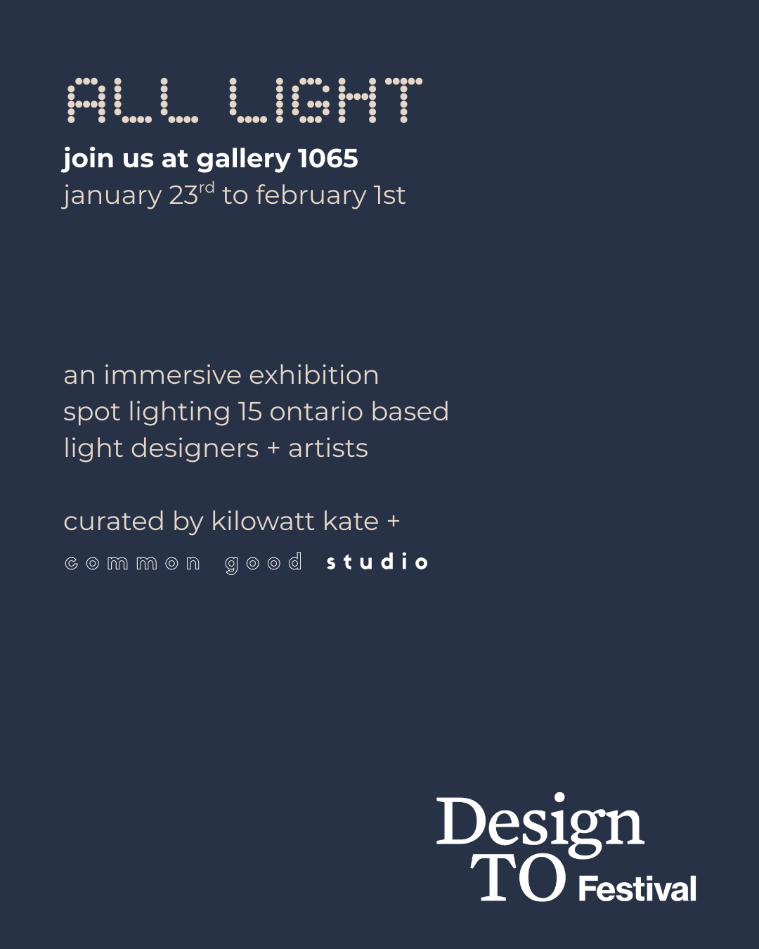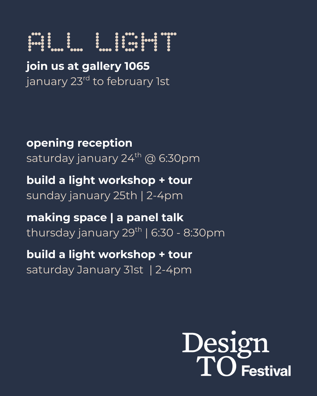The opening party for ALL LIGHT is Saturday, January 24 at Gallery 1065, 1065 Bloor St West, just east of Dufferin. If you can’t make the opening party, there will be a talk and lighting workshops. The exhibition runs for the duration of the festival, until February 1, 2026.